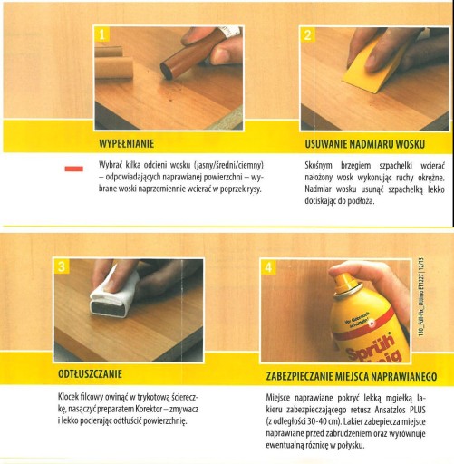 1. Wybieramy kilka odcieni (jasny, średni, ciemny) - odpowiadających naprawianej powierzchni - wybrane woski naprzemiennie wcierać w poprzek rys.