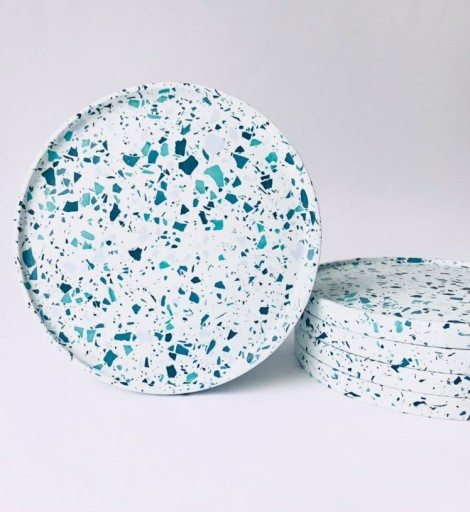 Podkładka na klosz: terrazzo w kolorze turkusu i błękitu. Wytworzona z gipsu polimerowego. Wykonanie Versalo Design.