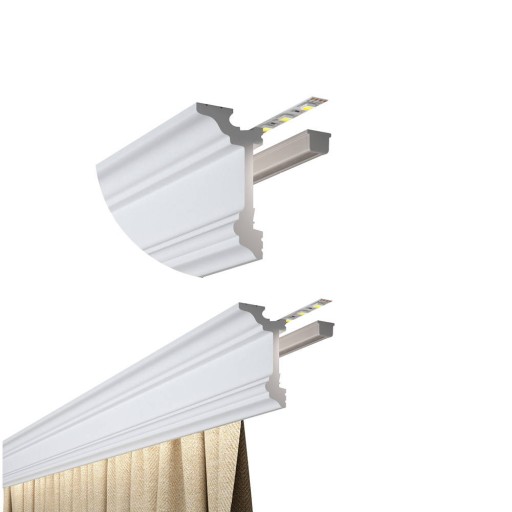 - Kształt listew pozwala na umieszczenie w specjaLnie zaprojektowanej wnęce taśmy LED. Dzięki temu listwa łączy funkcję maskowania karnisza z oświetlaniem pomieszczenia.