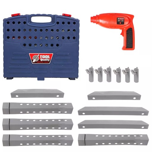 Ten wspaniały warsztat z narzędziami składa się z 67 elementów. Jest to idealny prezent dla małego majsterkowicza, które zapewni wiele godzin wspaniałej i ciekawej zabawy. Narzędzia bardzo dobrej jakości wykonane z realistycznym odwzorowaniem. Dzięki tej wspaniałej zabawce każdy miłośnik majsterkowania będzie mógł wcielić się w rolę majsterkowicza i pomocnika swojego taty. Dla jeszcze ciekawszej zabawy wkrętarka działa za pomocą baterii - można wkręcać nią śruby dołączone do zestawu. Zestaw składa się w poręczną walizkę, co pozwoli zabrać ulubioną zabawkę ze sobą gdziekolwiek zechce. Rozkładanie walizki odbywa się w prosty sposób, wystarczy przekręcić o 180 stopni jedną z części walizki, a następnie przy użyciu dołączonych do zestawu nóżek oraz śrubek należy je przykręcić. Troszkę większe dziecko bez problemu powinno poradzić sobie z tym samodzielnie. Zestaw bezpieczny. Zestaw rozwija kreatywność i pobudza wyobraźnie oraz uczy logicznego myślenia.