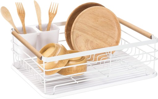 ✅Suszarka do naczyń cechuje wysoka jakość a także trwała i metalowa konstrukcja. Tacka wykonana z żywicy zabezpiecza blat przed zamoczeniem. Zestaw zawiera również plastikowy, dwukomorowy ociekacz na sztućce. Metalowa biała suszarka z drewnianymi uchwytami pasuje do każdej kuchni.