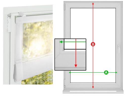 b) montaż rolety do ściany: wysokość ''B'' to wysokość wnęki okna + miejsce zajmowane przez pakiet*