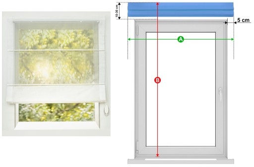 a) montaż rolety do sufitu: wysokość ''B'' to wysokość od sufitu do miejsca rozwinięcia rolety (np. do parapetu lub podłogi)