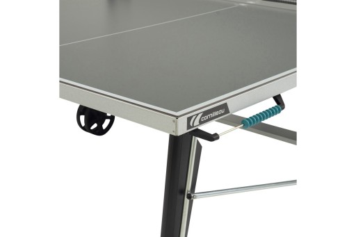 DUŻE KOŁA Z HAMULCAMI:Stoły ping pongowe Cornilleau posiadają duże podwójne koła o grubości 32 mm i średnicy 200 mm. Takie rozwiązanie zwiększa toczenie kół oraz stabilność stołu. Większe koło z łatwością wtoczy się przez duże przeszkody takie jak schody, progi kamienie. Łatwiej pokonuje gęstą trawę i inne nierówności, z kolei dwa hamulce zapewniają doskonałą stabilność i bezpieczeństwo podczas gry. Jest to także szczególnie przydatne gdy stół jest przechowywany na lekko nierównej powierzchni.