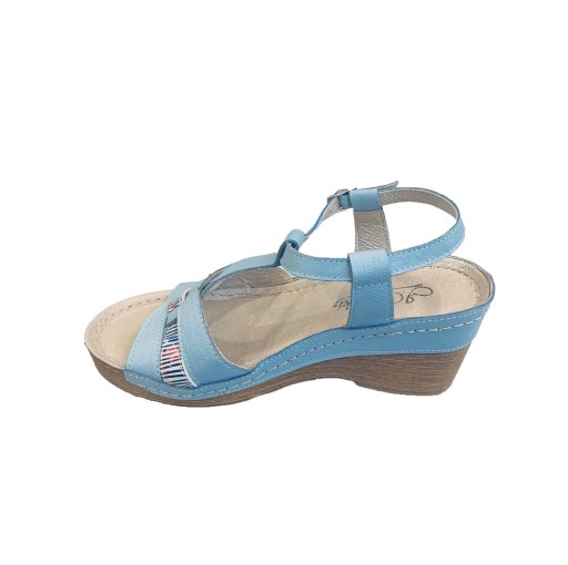 Damskie, niebieskie, skórzane sandały na koturnie (platformie), zapinane na sprzączkę. Najwyższa jakość cielęcej skóry i wykonania. Polski producent.