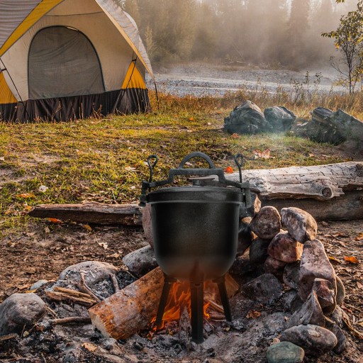 Posiada odkręcane nóżki, dzięki czemu możesz ustawić go na nóżkach bezpośrednio na ognisku bądź powiesić go na uchwycie nad źródłem ognia.