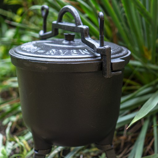 Kociołek wyposażony jest w solidną pokrywę z otworem, trzy stabilne nóżki oraz przykręcany uchwyt mocno dociskający pokrywę. Wykonany został z żeliwa odpornego na wysokie temperatury oraz ścieranie.