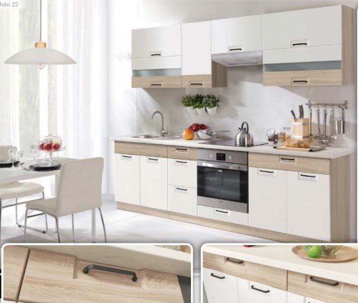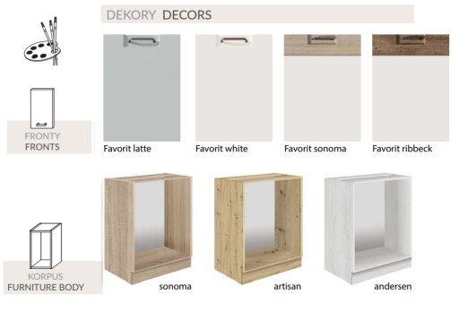 Korpusy szafek dolnych wykonane z płyty wiórowej laminowanej w kolorze sonoma, artisan lub andersen. Głębokość korpusów szafek stojących - 51 cm. Nóżki regulowane 10 cm (z płynną regulacją wysokości).