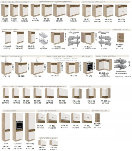 Korpusy szafek dolnych wykonane z płyty wiórowej laminowanej w kolorze sonoma, artisan lub andersen. Głębokość korpusów szafek stojących - 51 cm. Nóżki regulowane 10 cm (z płynną regulacją wysokości).