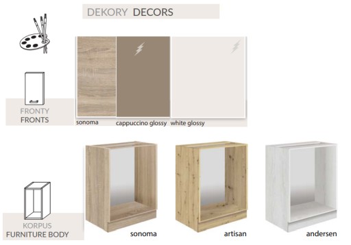 Korpusy szafek dolnych wykonane z płyty wiórowej laminowanej w kolorze sonoma, artisan lub andersen. Głębokość korpusów szafek stojących - 51 cm. Nóżki regulowane 10 cm (z płynną regulacją wysokości).