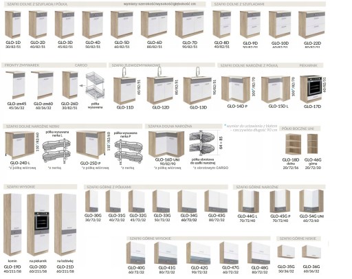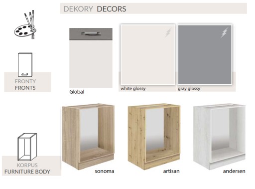 Korpusy szafek dolnych wykonane z płyty wiórowej laminowanej w kolorze sonoma, artisan lub andersen. Głębokość korpusów szafek stojących - 51 cm. Nóżki regulowane 10 cm (z płynną regulacją wysokości).