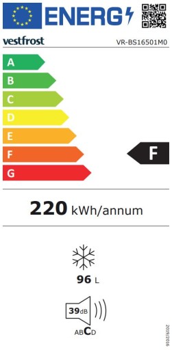 Zamrażarka szafowa VESTFROST VR-BS16501M0 do zabudowy o szerokości 59.5 cm, pojemności całkowitej netto 96 l, w klasie efektywności energetycznej F. Roczne zużycie energii - 220 kWh/rok. Ilość szuflad/klapek - 3.