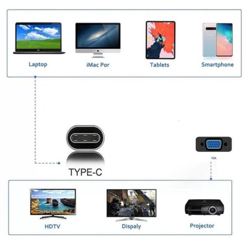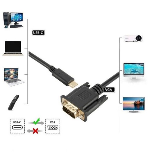 Kabel USB-C 3.1 USB Type C do VGA umożliwia podłączenie monitora lub projektora które posiadają port VGA do komputera, laptopa, tabletu lub smartfona za pomocą portu USB-C lub Thunderbolt 3. Kabel obsługuje rozdzielczości do Full HD 1920x1080p 60Hz. Kabel przesyła dane jednokierunkowo z USBC do VGA.