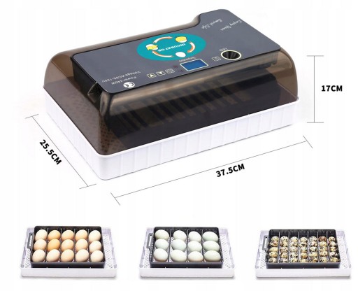 Profesjonalny inkubator nadaje się do wylęgu maksymalnie 35 małych jaj i do 12 kurzych. Inkubator jest wyposażony w automatyczną, cyfrową regulację stałej temperatury.