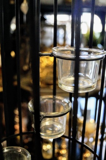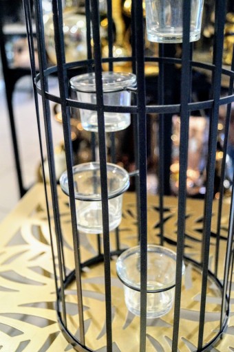 Lampion w kształcie butelki wykonany z metalu w kolorze grafitowym. W środku znajdują się szklane podstawki pod świeczki.