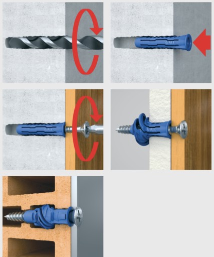 Skrzydełka antyrotacyjne wzmacniają przyczepność kołka w szerokim zakresie podłoży, w tym w miękkich podłożach murowych i w płycie gipsowo-kartonowej.