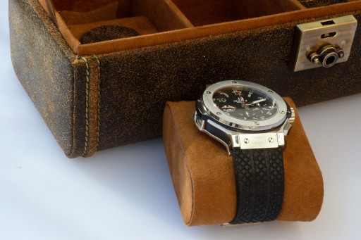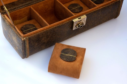 Luksusowe pudełko ( etui) skórzane na 4 zegarki wykonane jest ręcznie na bardzo wysokim poziomie artystycznym z wielką dbałością o szczegóły, stanowi idealne miejsce do przechowywania zegarków..