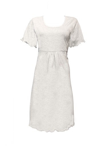 Urocza koszula damska długości do kolan, w pięknym szaromelanżowym kolorze, z krótkim rękawem oraz okrągłym dekoltem. Dół koszuli oraz rękawki, są zakończone mereżką, a dodatkowym atutem jest odcięcie i delikatne marszczenie pod biustem.