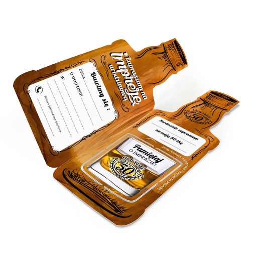 Zabawne zaproszenie na urodziny w kształcie butelki whisky Daniels'a wykonane z wysokiej jakości niepowlekanego, bezdrzewnego papieru klasy premium o z wysokim współczynnikiem białości zapewniający doskonałe krycie i kontrast dla tekstów i grafiki.