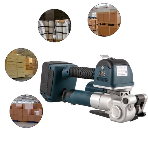 Zasilana bateryjnie stalowa wiązarka zawiera dwie baterie litowe 4000 mAh. Może spakować około 200 pasków na jednym ładowaniu. Ładowanie trwa 90 minut.