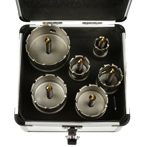 Zestaw 6 szt. otwornic TCT do metalu w rozmiarach 22-65mm. Ostrza wykonane z węglików spiekanych, które charakteryzują się znacznie większą twardością oraz odpornością na wysokie temperatury w porównaniu do stali szybkotnącej HSS. Przeznaczone do wykonywania większej średnicy otworów w stali, żeliwie, metalach kolorowych, drewnie, tworzywach sztucznych itp. Dla zwiększenia precyzji cięcia zastosowano wiertło prowadzące ze stali HSS. Sprężyna zamocowana na wiertle prowadzącym, pozwala w łatwy sposób usunąć urobek.