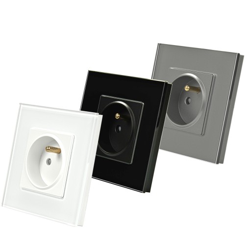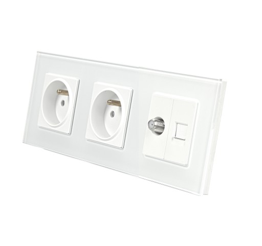Gniazdko elektryczne 230V z modułem komputerowym RJ45 i antenowym SAT w potrójnej ramie szklanej.