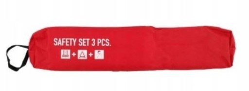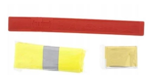 Przedmiotem sprzedaży jest zestaw ostrzegawczy do auta zawierający trójkąt ostrzegawczy, koc termiczny oraz kamizelkę odblaskową.