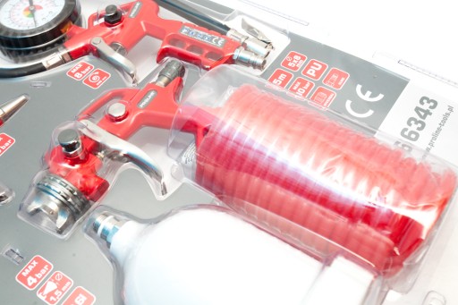 - W zestawie: pistolet lakierniczy z górnym zbiornikiem (66345); pistolet do pompowania (66346); pistolet do mycia (66347); pistolet do przedmuchiwania (66348); wąż pneumatyczny spiralny PU (66350)