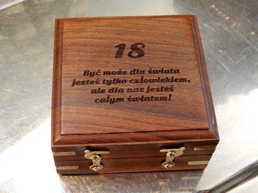 Możemy wygrawerować Twój tekst. Płytka z laminatu grawerskiego o wymiarach 8x9,5 cm wklejona wewnątrz pokrywy. Zobacz przykłady.