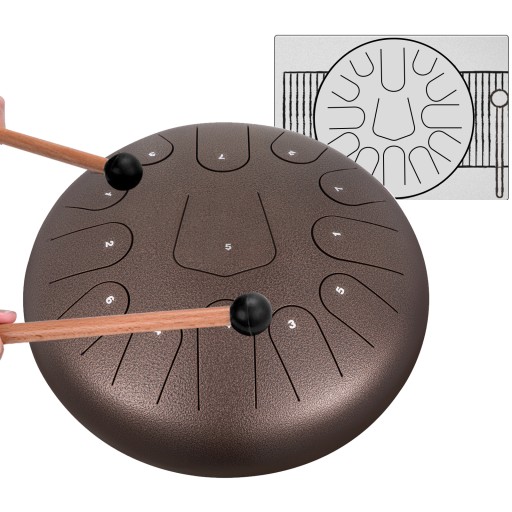 13-tonowy bęben muzyczny: 12-calowy stalowy bęben w 13 językach ma w sumie 13 dźwięków w C-dur. Ułatwia to naukę i ma szerszy zakres dźwięków.