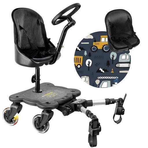 Obrotowa kierownica zapewni przyjemność z jazdy Twojemu dziecku, a świecące kauczukowe kółeczka sprawią, że dostawka będzie lepiej widoczna po zmroku.