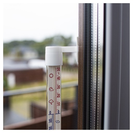 Termometr zaokienny, który można przybić jak i przykleić do okna.. Posiada specjalne końcówki z taśmą klejącą umożliwiają przymocowanie termometru (bez konieczności wiercenia otworów) do opraw okiennych wykonanych z tworzyw sztucznych, aluminiowych lub drewnianych. Dodatkowo uchwyty posiadają otwór umożliwiający przykręcenia termometru. Skala termometru nadrukowana jest na tekturowej podkładce, umieszczonej w szklanej rurce, z dwóch stron zakończonej plastikowymi korkami.