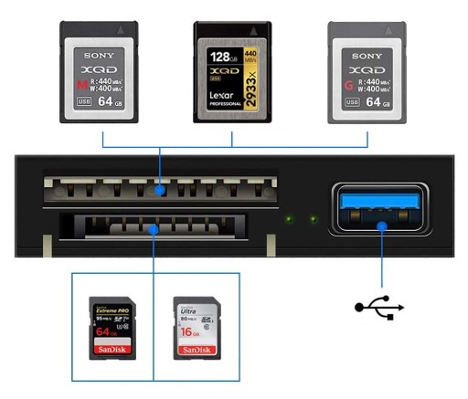 Nowy, uniwersalny czytnik kart pamięci XQD / SD / SDHC / SDXC / USB 3.0 z przewodem USB 3.0. Pozwala łatwo przesyłać duże ilości zdjęć RAW i filmów 4K do komputerów PC lub laptopów (w kilka sekund), dzięki prędkości przesyłu do 500MB/s dla kart XQD i do 104MB/s dla kart SD. Dodatkowe gniazdo USB 3.0 pozwala na podłączenie do czytnika myszki, klawiatury, dysku, pendrive lub innego urządzenia USB.