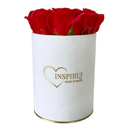 4️⃣ Kolor: Białe pudełko z czerwonymi różami mydlanymi.