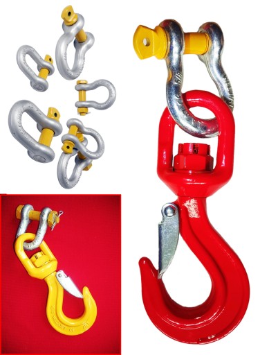 WYKONANIE: Hak obrotowy z krętlikiem na łożysku ślizgowym który pozwala swobodnie obracać się wokół własnej osi pod obciążeniem połączony z szeklą dopasowaną do haka . Zestaw wykonany ze stali kutej matrycowo, hartowanej w klasie wytrzymałości 8. Hak posiada zapadkę zabezpieczającą przed wypięciem liny. Szaklę