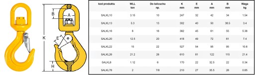 - Oznakowanie haka i szakli: kodem producenta, WLL, rozmiarem, znakiem CE /„Conformité Européenne” (zgodność europejska),