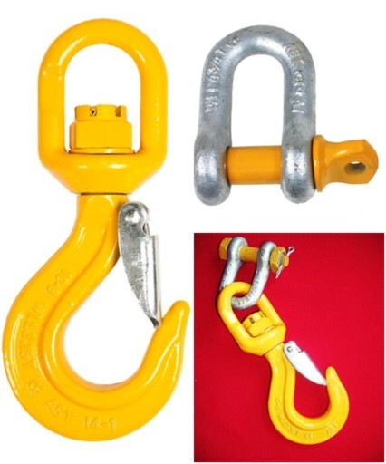 WYKONANIE: Hak obrotowy z krętlikiem na łożysku ślizgowym pozwala swobodnie obracać się wokół własnej osi pod obciążeniem, połączony z szeklą dopasowaną do haka . Zestaw wykonany ze stali kutej matrycowo, hartowanej w klasie wytrzymałości G80. Hak posiada zapadkę zabezpieczającą przed wypięciem liny