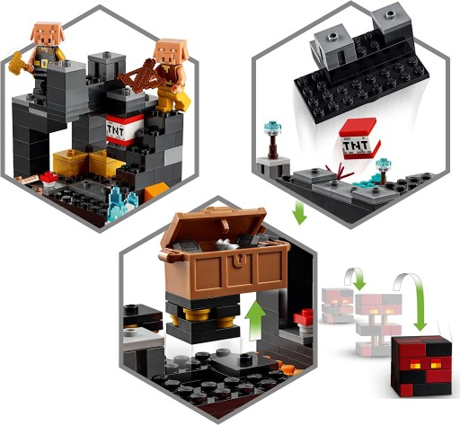 W trakcie podróży do bastionu w ognistym Netherze gracze będą walczyć z przeciwnikami i zmierzą się z licznymi wyzwaniami, po drodze zbierając przedmioty zachęcające do jeszcze lepszej kreatywnej zabawy. Wśród znanych z Minecrafta postaci znajdują się poszukiwacz przygód z Netheru, kostka magmy, piglin okrutnik, piglin i magmołaz. Zestaw ma kilka specjalnych funkcji, takich jak funkcja wybuchu aktywowana przez umieszczenie bloku TNT w odpowiednim miejscu i naciśnięcie przycisku. Dzieci rozpoznają tu też znane z gry akcesoria, m.in. karmazynowy korzeń, spaczony grzyb, złocony czernit, netherową brodawkę, czerwone grzyby, eteryczne pochodnie, bloki złota, netherowe złoże złota, eteryczny ogień oraz broń — złoty topór, kuszę i netherytowy miecz. W zestawie są również blok TNT, wędka i skrzynia skarbów zawierająca odłamki netherytu, bryłki złota i schab. Zestaw można przebudowywać, aby przeżywać nowe, nieograniczone przygody — zupełnie jak w Minecrafcie.