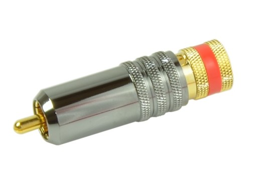 Wtyk RCA z pinem sygnałowym z miedzi tellurowej, izolacją teflonową, zaciskiem śrubowym przewodu sygnałowego oraz możliwością blokady na gnieździe.
