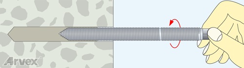 4. Podczas umieszczania pręta w otworze obracaj go wolno w kierunku przeciwnym do ruchu wskazówek zegara, aby usunąć zbędne powietrze. Upewnij się, że pręt został zatopiony w zaprawie na wymaganą głębokość.