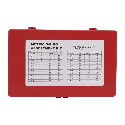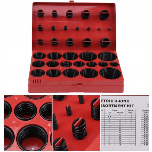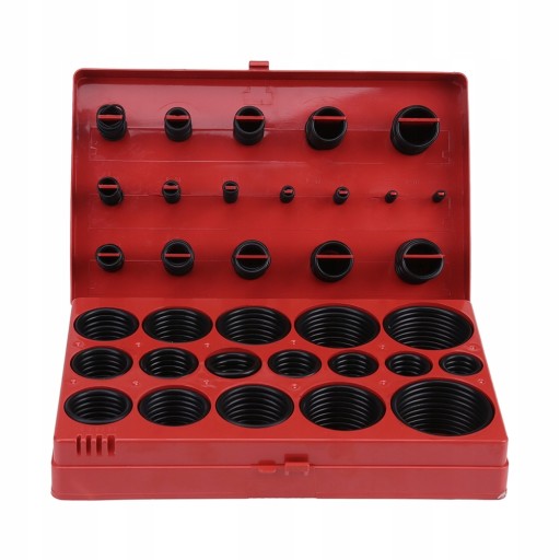 Zestaw 419 sztuk oringow wykonanych z NBR. Zestaw zawiera rozmiary od 3x1.5 mm do 50x3.5 mm. Całość umieszczono w wygodnym opakowaniu typu "sortownik".
