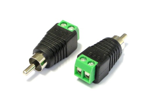 Wysokiej przejściówka służąca np. do podpięcia do kamery zakończona z jednej strony wtykiem RCA CHINCH na kostkę połączeniową 2 torową.