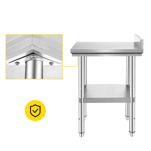 Solidny materiał: nogi podtrzymujące stół o średnicy 4,8 cm, grubość górnej warstwy to 7,62 cm. a grubość dolnej warstwy wynosi 4,1 cm. Stół do przygotowywania żywności jest wykonany ze stali nierdzewnej, z obróbką rysunkową powierzchni, która zapewnia doskonałą odporność na korozję, trwałość, łatwość czyszczenia, a także oparcie zapobiegające spadaniu żywności.