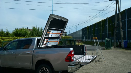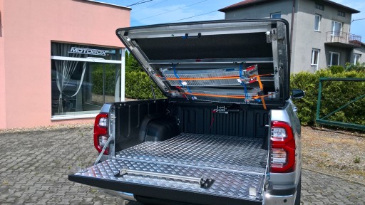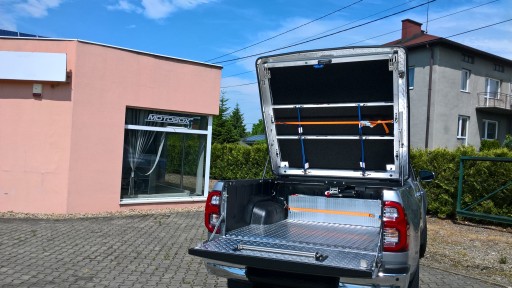 Zabudowa skrzyni ładunkowej dla myśliwego. W skład zabudowy wchodzą: pokrywa aluminiowa podnoszona na siłownikach lakierowana lakierem strukturalnym matowym czarnym, relingi wzdłużne, podłoga aluminiowa, natrysk ochronny burt, wyciągarka, rolka poprzeczna, rampa załadunkowa, dodatkowe gniazda elektryczne. Produkcja oraz montaż: KMG Bielsko Biała. <607>769<046>