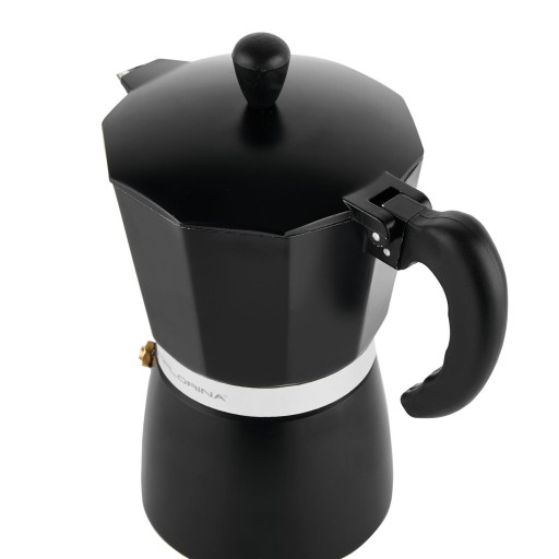 Kawiarka zbudowana jest z zaledwie 3 elementów. Brak drobnych części ułatwia obsługę urządzenia i chroni je przed zbędnymi uszkodzeniami. Całość uzupełniona jest dobrze wyprofilowanym uchwytem i szczelnie zamykaną pokrywką, która eliminuje rozpryskiwanie i rozlewanie kawy podczas przelewania. Intensywna czerń kafetiery wkomponuje się w nowoczesny wystrój kuchni.