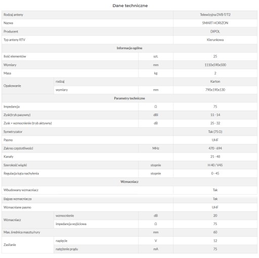Wymiary opakowania anteny DIPOL SMART HORIZON to: 79 x 19 x 13 cm. Jest to jedno z bardziej kompaktowych opakowań wśród tego typu anten na rynku. Ten wydawałoby się mniej znaczący fakt cieszyć powinien każdego instalatora, dla którego przewożenie dużych anten w większej ilości lub z innymi akcesoriami instalatorskimi bywa kłopotliwe.