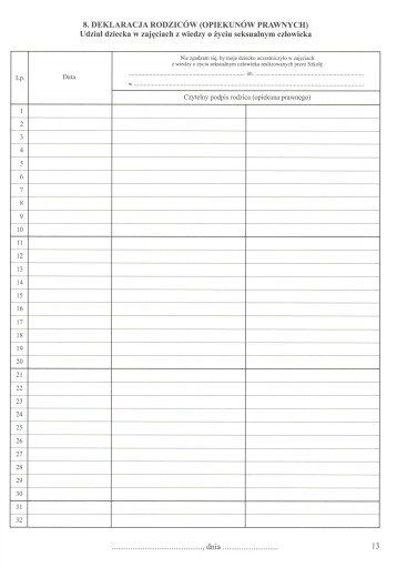 8. Deklaracja rodziców w sprawie zajęć z wiedzy o życiu seksualnym człowieka