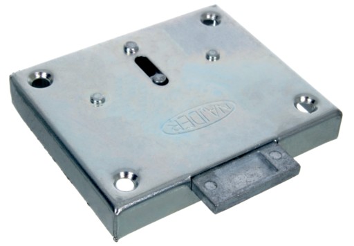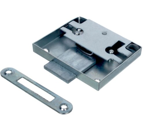 Zamek meblowy nakładany mocuje się od wewnętrznej strony mebla. Zamek pokryty jest warstwą cynku.
