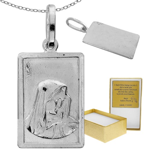 Srebrny medalik przedstawiający postać Matki Boskiej w kształcie prostokąta. Wykonany z wysokiej próby srebra, jaką jest próba 925. Na odwrocie medalika, na życzenie klienta, możemy wykonać grawer zupełnie za darmo. Sprawi on, że medalik nabierze wyjątkowego, indywidualnego znaczenia. Medalik wspaniale sprawdzi się w roli prezentu na chrzest, bierzmowanie czy komunię świętą.