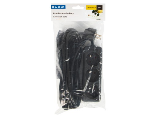 Przedłużacz sieciowy BLOW w kolorze czarnym z trzema gniazdami przeznaczony do użytku domowego. Przedłużacz pozwala podłączyć urządzenia, które są oddalone od gniazda elektrycznego. Produkt z jednej strony posiada 3 gniazda obrócone pod kątem, a z drugiej pojedynczy kątowy wtyk sieciowy.